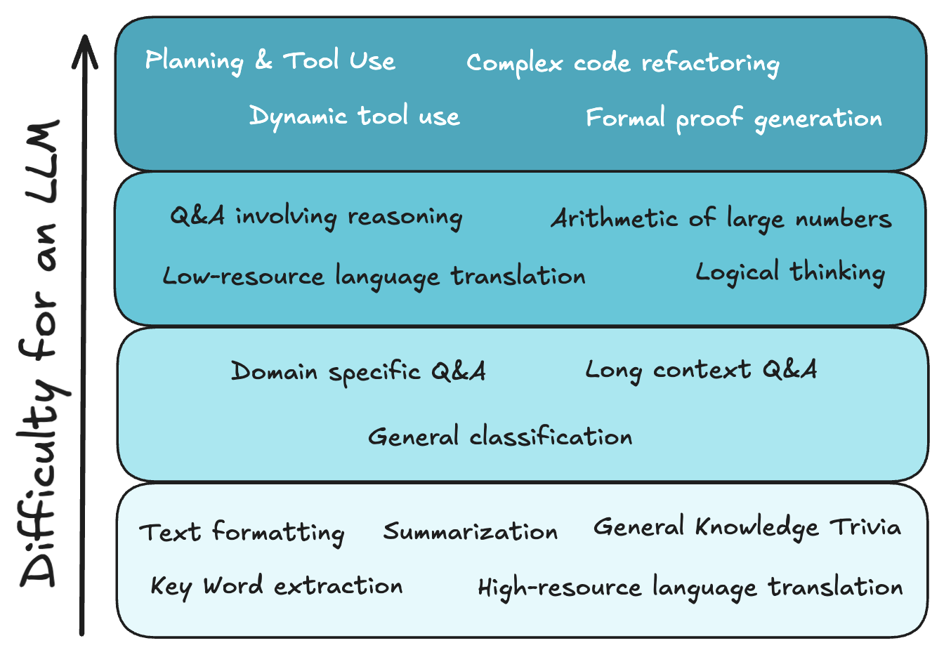 The easier the task, the more you can save by using a smaller model. The diagram below offers an approximate ranking of task difficulty for LLMs..