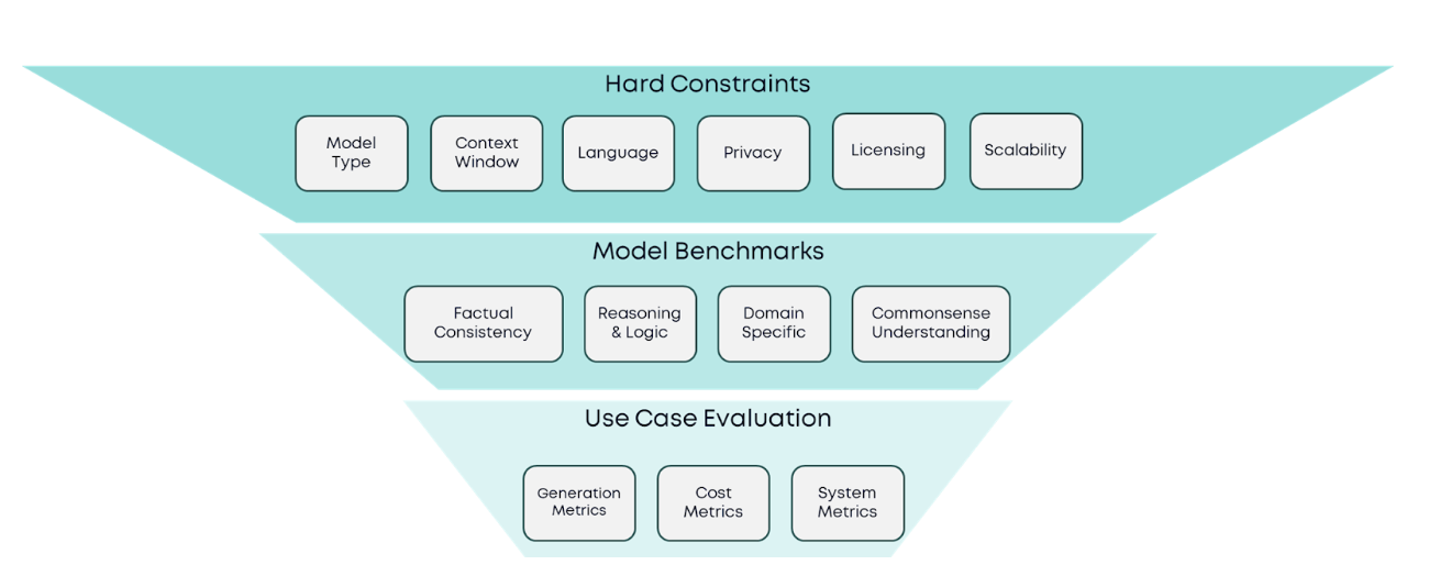 Before comparing the performance of every model that exists, we should first identify the hard constraints of our application. Hard constraints are requirements that are deal breakers—if a model doesn’t meet these requirements, it’s automatically out of the running. These constraints should be our starting point, serving as an initial filter that simplifies the decision process by narrowing down the options. For instance, if our application processes long documents, a model with sufficient context length is an essential requirement, and others that lack it can be discarded without another thought.