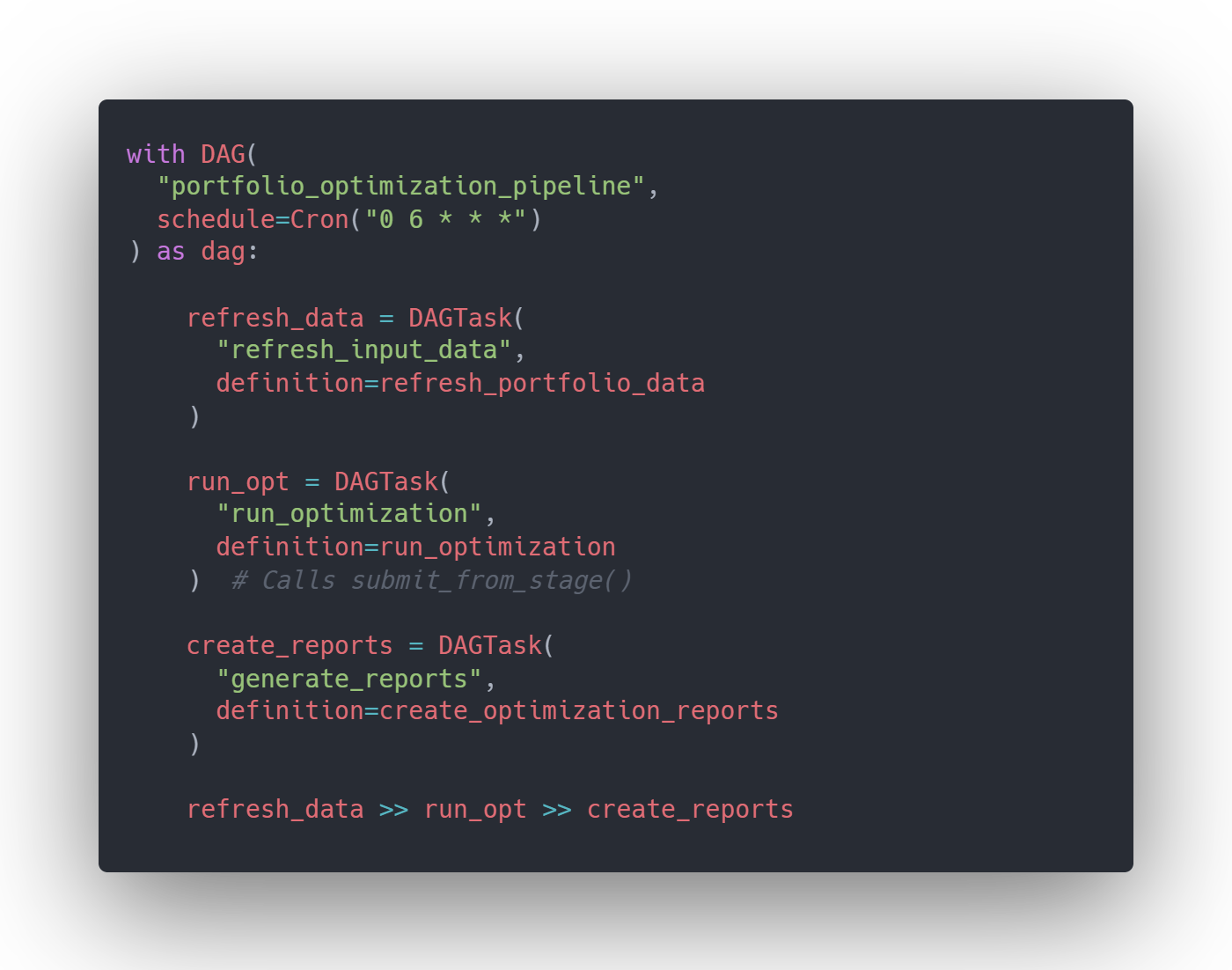For this integration, `submit_from_stage()` is required because Tasks execute within Snowflake's infrastructure and can't access your local filesystem. Your model files must be uploaded to a stage first, then your Task functions reference that stage location when submitting jobs. Here's a complete DAG for the portfolio optimization pipeline (Figure 3):